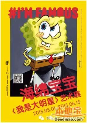 绵宝宝中国首秀正式登陆上海啦!海绵宝宝《I’m Famous- 我是大明星》艺术展将以美国著名系列电视动画《海绵宝宝》经典形象为起点,联同15位来自两岸三地和多位国际知名艺术家、设计师与明星重新创作,于5 月1日起,在“国内创意园区发源地”且成为地标性区域的田子坊创意园区内呈现最原汁原味的经典形象及首创跨界独立艺术展。