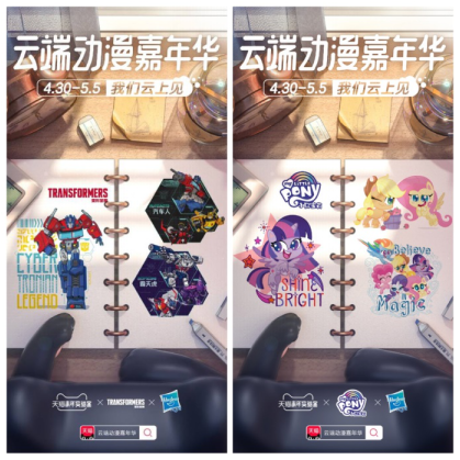 今年4月,孩之宝参与了天猫举办的云端动漫嘉年华,并与众多知名IP一起,将怀旧情怀与年轻人喜欢的动漫潮流相结合,通过直播的形式开启一场可玩、可逛、可买的云端动漫体验。