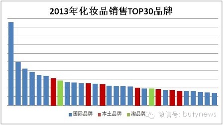虽然说淘品牌在化妆品行业成功逆袭,但不可置否的是,传统品牌,特别是国际一、二线品牌依然在这个行业唱主角。在淘宝上年度销量排名前十的化妆品品牌里面,本土品牌只有百雀羚和阿芙,他们分别排在第七和第八名,他们也分别代表了来自本土品牌中的传统品牌和淘品牌的力量。本土品牌无一挤进前五。排名第11到第30名的品牌里面,本土品牌共有7个(目前仍将美即列为本土品牌),包括淘品牌御泥坊。其他淘品牌即使是规模较大的如膜法世家·1908、圣荷等也得排到50名左右。