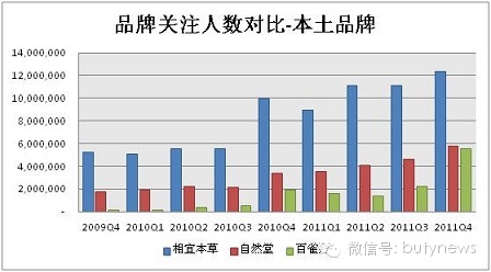第一个敞开怀抱积极拥抱电子商务的传统品牌当属相宜本草。相宜本草的天猫旗舰店与淘宝商城同步上线。旗舰店的推出对增加品牌曝光的效果立杆见影。早在 2010年,相宜本草在淘宝上的季度品牌关注人数就已达到了500万,而本土一线品牌自然堂的关注人数只有200万左右。在线下与相宜本草处于同一梯队的百雀羚在线上的关注人数几乎可以忽略不计。