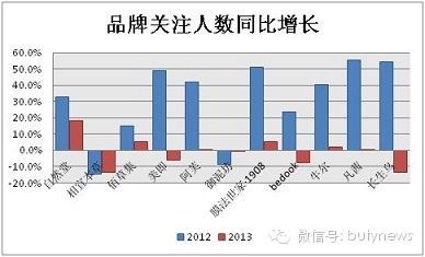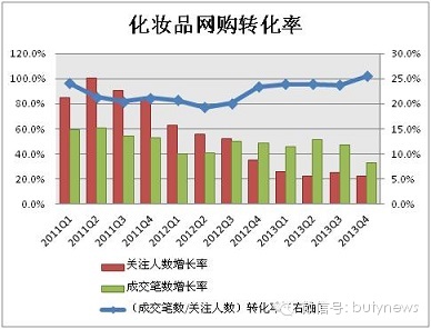 但另一方面,关注人数的增长率则清楚的显示出了行业的隐忧:网购的流量红利期已经悄然结束。2013年,淘宝化妆品类目的流量同比只增长了23.5%。对比前两年,这一增幅分别为89.7%和49.2%。化妆品网购用户的增长幅度正在快速下滑。