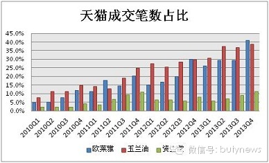 在接下来的三年里,欧莱雅每年将这一比重提高了10%。到2013年第四季度,欧莱雅来自天猫的成交笔数占到品牌全平台成交的41.1%。考虑到官方旗舰店的客单价通常更高,欧莱雅来自官方渠道的成交金额占比已经过半。