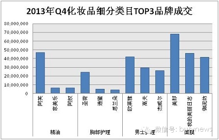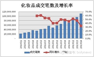 流量是电子商务的基础,它在很大程度上影响着成交的走势。2013年第四季度,淘宝化妆品的成交笔数同比只增长了33.2%。2013年全年,这一增长速度也只有32.8%。而2011年和2012年淘宝化妆品的成交笔数分别同比上涨了53.1%和41.5%。化妆品成交的增速几乎每年下降10个百分点。