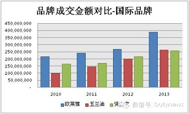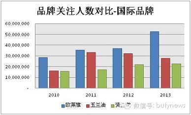 所以,虽然从2010年欧莱雅官方旗舰店上线到2012年整整两年的时间里,欧莱雅品牌的关注和成交并未大幅提升,但欧莱雅用这两年时间初步完成了线上渠道的规范化。进入2013年以后,欧莱雅开始表现出爆发力。这一年,欧莱雅品牌的关注人数同比上年增加了43.2%,品牌成交金额也实现了同比例的提升。这一增长幅度远高于其他国际大众品牌。