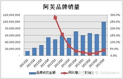 阿芙是其中的一个典型。2009年下半年,阿芙登录淘宝。在尝到了电子商务的甜头以后,2010年3月,阿芙官方旗舰店在天猫正式上线。阿芙由此开始了爆发式的增长。2010年,阿芙品牌销量尚不足1000万,2011年,这一销量被迅速抬升到了1.2亿。2012年,阿芙的销量超过2亿。2013年,仅在淘宝平台(包括天猫)上,阿芙品牌的销量就已经接近3亿元。在国际一、二线品牌和本土一线品牌的强敌环绕下,阿芙依然挤进了淘宝化妆品品牌前十的行列。