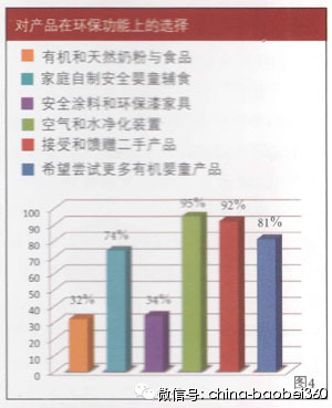 污染问题色令这些高层次消费者们认识到积极倡议与投入环保的重要性。北京与上海的一些外籍人士发起的环保循环使用二手婴童家具、手推车、儿童安全椅以及餐桌等民间组织已经存在,例如上海虹桥的日籍家庭们,有固定的二手家具店用以买卖二手婴童用品。在被调查的中国父母中,认为这一环保举措可以接受的占42%,但提出仅限于经过彻底卫生消毒的二手货。不过,中国父母们更多倾向于馈赠而不是买卖二手婴童用品,92%的父母表示接受或者馈赠过别人婴童用品。但接受方表示,他们真正会用到的是六成新以上的用品,一是因为产品质量有保质期,二是因为太旧了没面子。