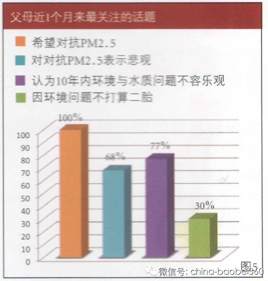 被调查父母中,表示希望获得有机奶源与食品的占32%;在家庭装修和家具购买时采用环保安全漆的占34%;希望以其他渠道改善家庭水源和空气质量的占95%,例如添置空气净化器、水质净化器、硅藻泥墙面漆、添置更多吸附化学物质的绿色植物等等。22%希塑能够在婴童生活用品上增加抗污染类功能。但68%的父母认为对PM2.5类污染无能为力,表示出沮丧悲观的态度,认为政府须从源头做起正面应对,从而改善污染状况,因为仅仅靠防护难以解决问题。