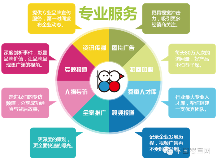 中国婴童网旗下分设了12个子行业网站,实现了整个婴童产业全覆盖。栏目包括软文资讯、招商加盟、产品展示、人物专访、视频报道、开店指导等,为孕婴童品牌提供360度全方位网络传播和行销服务支持。