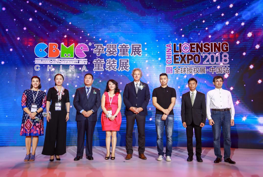 腾讯视频商业化总经理王莹与主办方亚洲博闻副总裁马颖、国际授权业协会主席兼首席执行官Maura Regan、尤妮佳(中国)投资有限公司董事长总经理宫林吉广、盈峰母婴(贝贝熊孕婴童)总经理闫炳炜等重量级嘉宾共同启动2018全球授权展·中国站