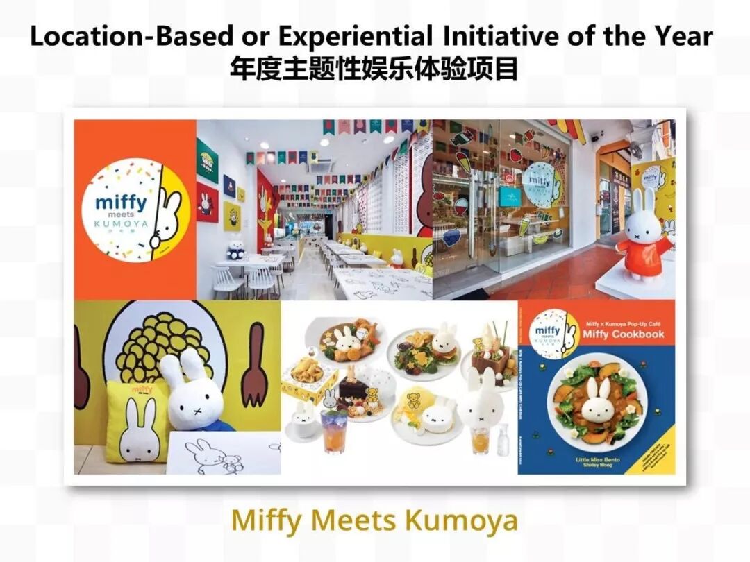 2019年1月7日在香港举行的2018LIMA亚洲授权业卓越大奖颁奖典礼上Miffy获得两项殊荣: 【年度主题性娱乐体验项目】 这项年度颁奖典礼一直备受业界瞩目,也一直获得授权业界的高度肯定和鼎力支持,不仅展示了亚洲地区独特创新和卓越表现的品牌与企业,同时也推动了授权行业的发展。让我们在庆祝Miffy获奖的同时,再来回顾一下这些精彩的活动与产品吧! MIFFY MEET KUMOYA MIFFY MEET KUMOYA 整间店以黄色橙色作为主色调 所有菜品由新加坡出名的菜品造型师 Shirley Wong和Kumoya团队一起合力打造